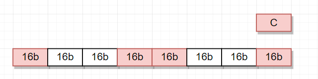 例えば,128-bitの命令キャッシュブロックに以下のように命令が含まれていたとする.赤いブロック(16-bit)はRVC命令で,白いブロックはRVI命令を含む. 白いブロックはRVIなので,当然2ブロックで連続となる. この例では,とりあえずRVI命令のアラインがずれていることは考えず,最初の1ブロックにRVC命令が挿入されている一般的なケースを考える.